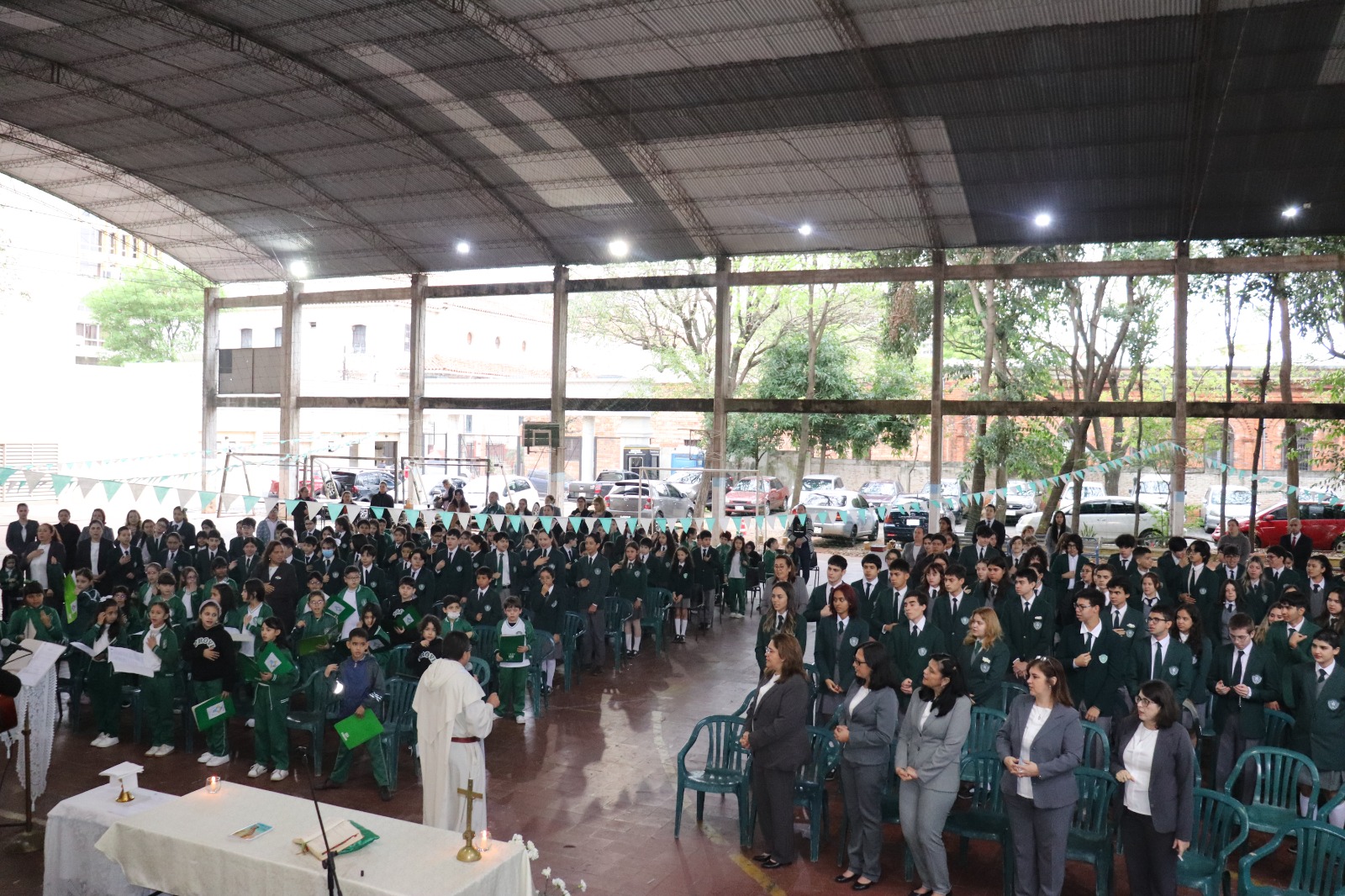 La eucaristía de acción de gracias por el aniversario, fue oficiada por el Padre Leoncio Vallejos en el polideportivo del colegio, con la asistencia de alumnos, docentes y directivos.