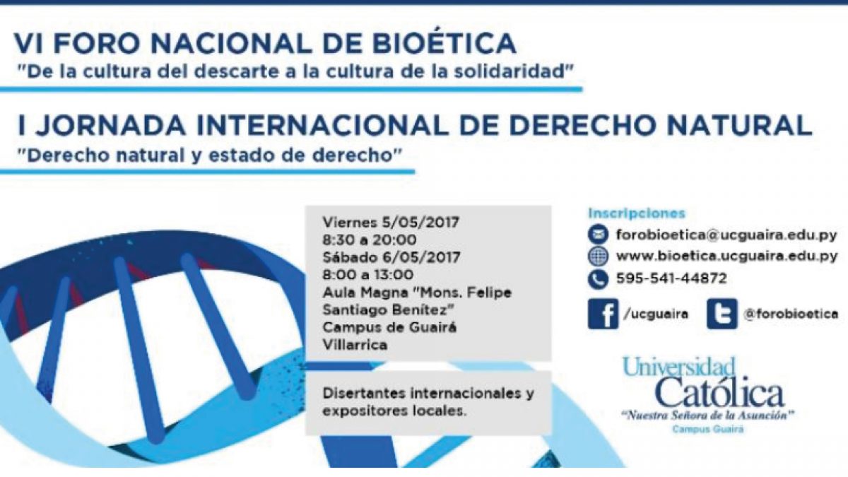 “De la cultura del descarte a la cultura de la solidaridad” es el lema del VI Foro Nacional de Bioética, que inicia el viernes 5 de mayo de 2017, a partir de las 8:30, en el aula magna del Campus de Guairá. En simultáneo, también, se realiza la I Jornada de Derecho Natural y Estado de Derecho. Concluyen al sábado 6.