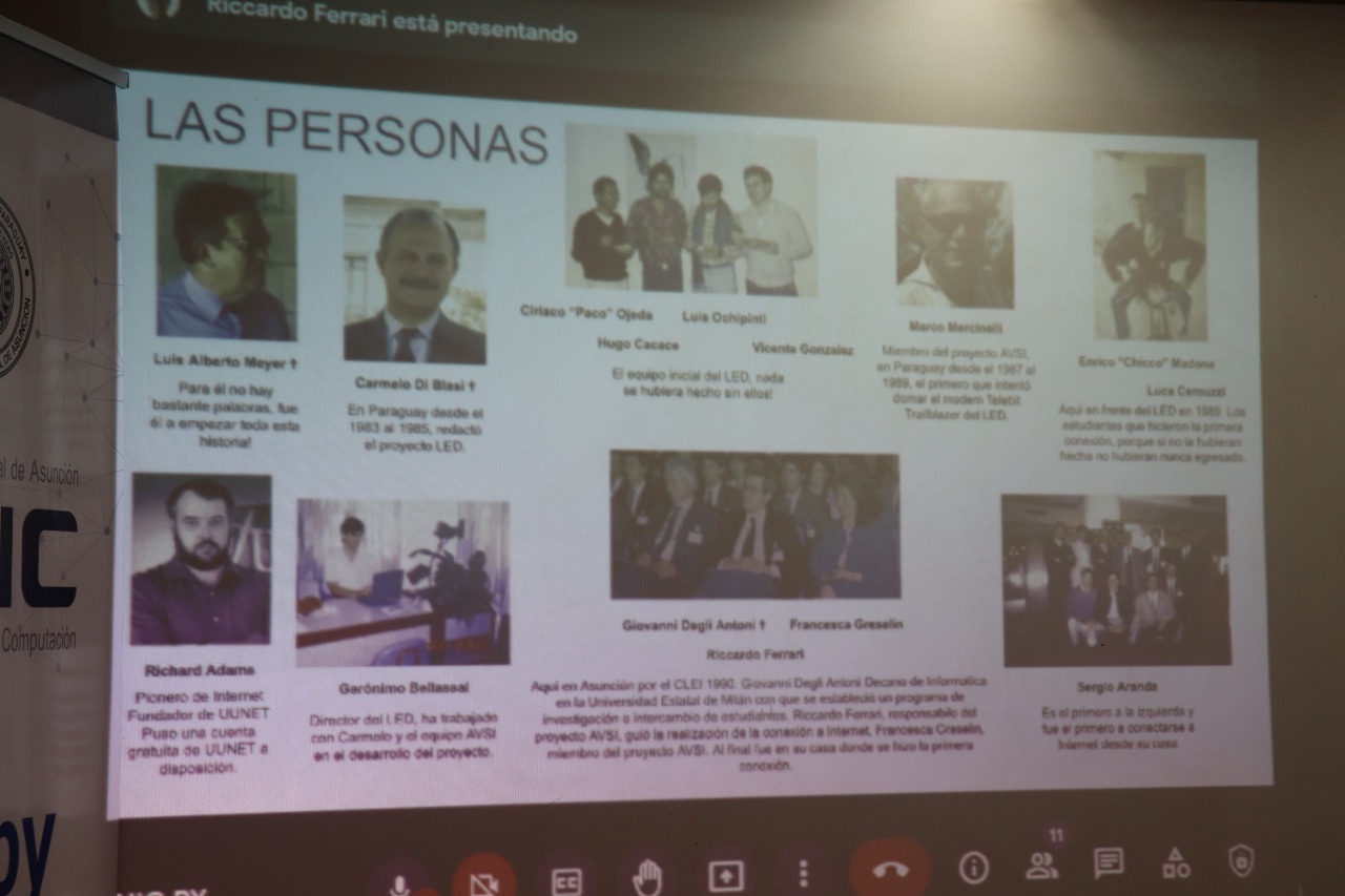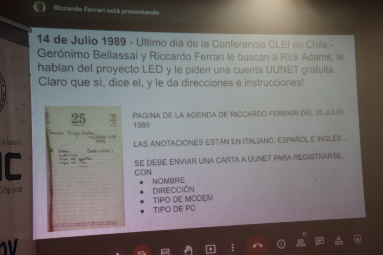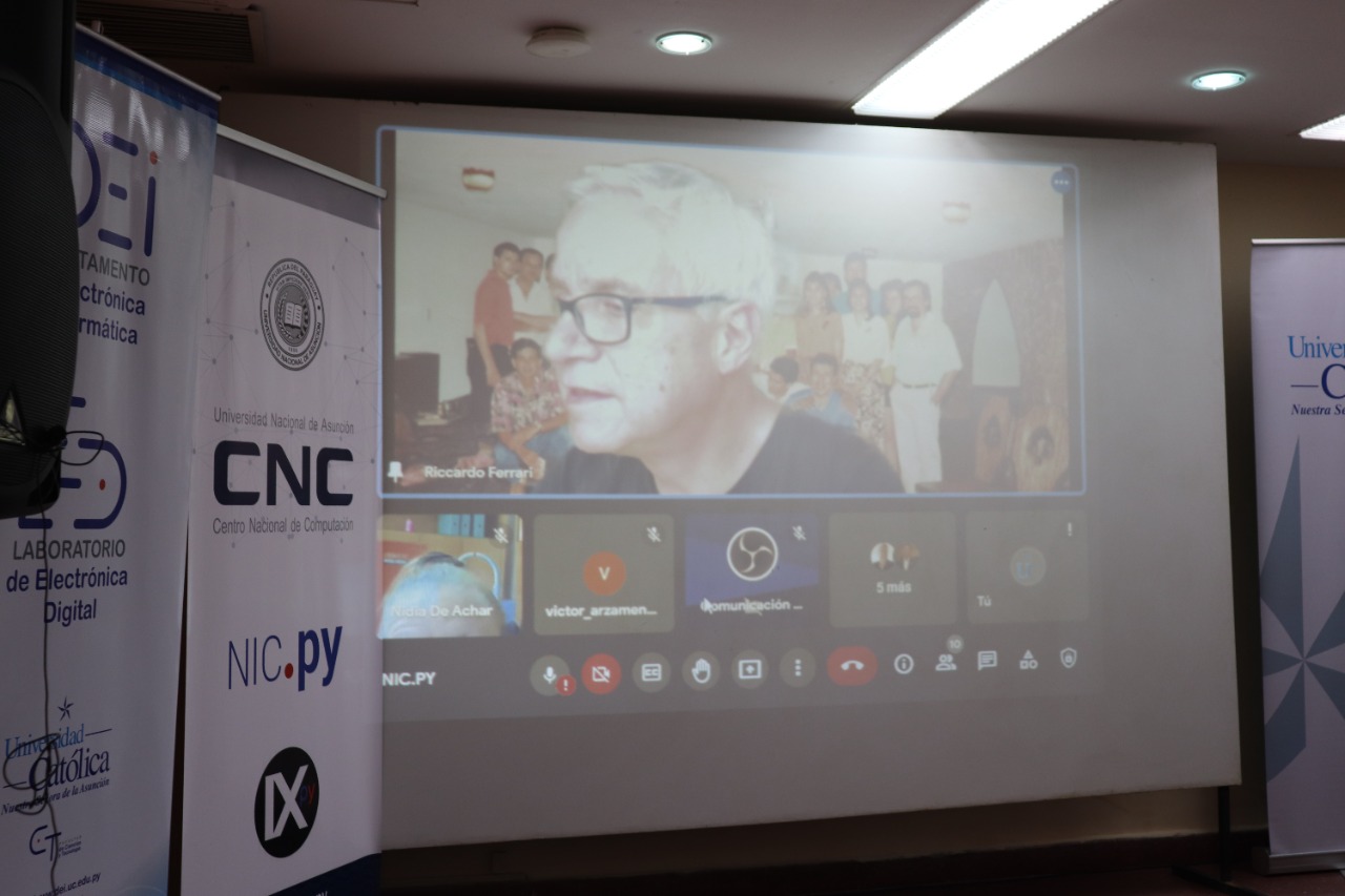 Y por último en el orden de alocuciones, se contó con la participación y conexión desde Italia del Dr. Riccardo Ferrari, impulsor de la primera conexión permanente de Paraguay a internet, quien expuso una emotiva y detallada presentación de los inicios de todo el proceso de registro del dominio, anécdotas y registro fotográfico de archivo histórico.
