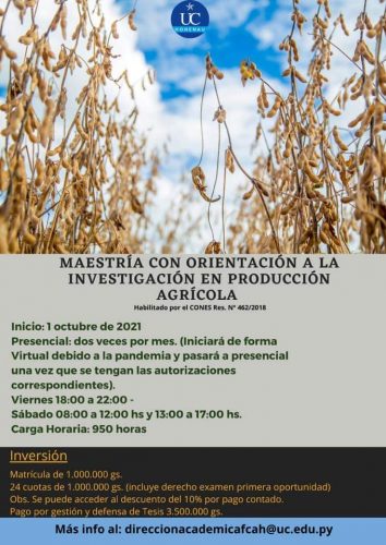 El 1 de octubre de 2021 dará inicio la Maestría con Orientación a la Investigación en Producción Agrícola, habilitada por el CONES según Resolución N° 462/2018 de la Facultad de Ciencias Agropecuarias de la Unidad Pedagógica Hohenau, a desarrollarse en la modalidad virtual a través del uso de herramientas digitales de enseñanza. Y con clases presenciales dos veces por mes.
