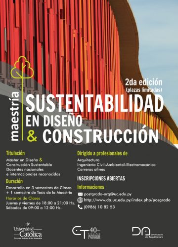 La Facultad de Ciencias y Tecnología de la Universidad Católica «Nuestra Señora de la Asunción», a través del Departamento de Arquitectura, invita a arquitectos, ingenieros (civil, ambiental o industrial), diseñadores y profesionales de carreras afines a participar del programa de la Maestría “SUSTENTABILIDAD EN DISEÑO & CONSTRUCCIÓN”, habilitada por Resolución N° 801/16 del CONES.