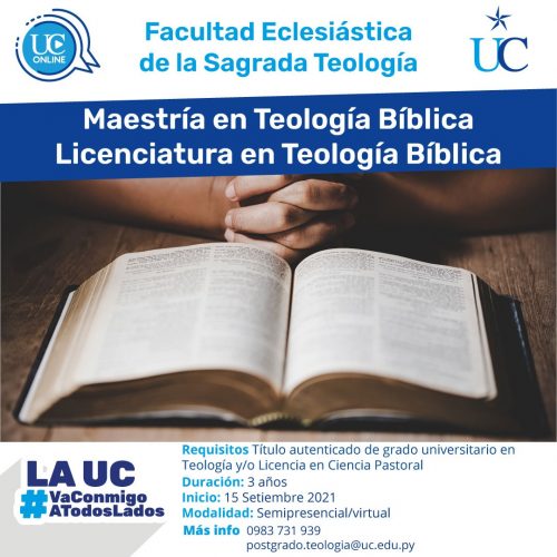 La Facultad Eclesiástica de la Sagrada Teología invita a cursar la Maestría en Teología Bíblica y Licenciatura en Teología Bíblica, habilitada por el CONES y con validez eclesiástica aprobada, que tendrá inicio el próximo 15 de septiembre en la modalidad semipresencial y tendrá una duración de tres años. Está dirigida a personas con título de grado universitario, Bachiller en Teología y/o Licenciatura en Ciencia Pastoral.