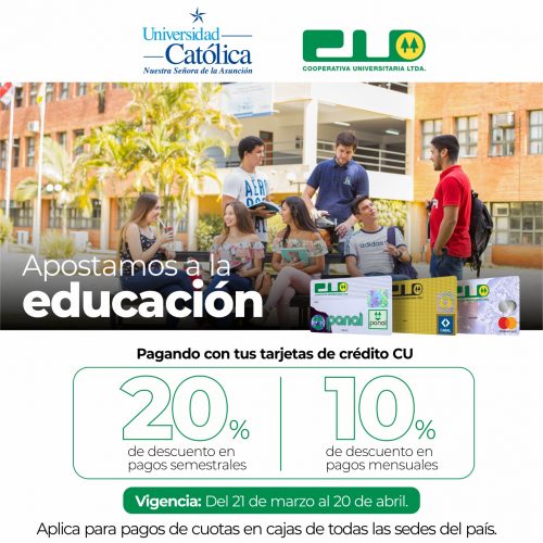 Recibirán descuentos en el pago de cuotas del semestre con tarjetas de crédito de la Cooperativa Universitaria, 10% de descuento en pagos mensuales y 20% de descuento en pagos semestrales. Promoción aplicable a pago en cajas de la Universidad Católica.