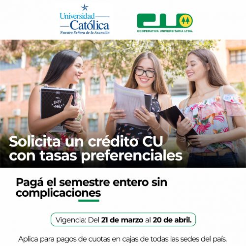 Los estudiantes de la Universidad Católica «Nuestra Señora de la Asunción» en todas las sedes podrán acceder a los beneficios en el pago de cuotas del semestre, a través del convenio firmado con la Cooperativa Universitaria. La promoción estará vigente del 21 de marzo hasta el 20 de abril.