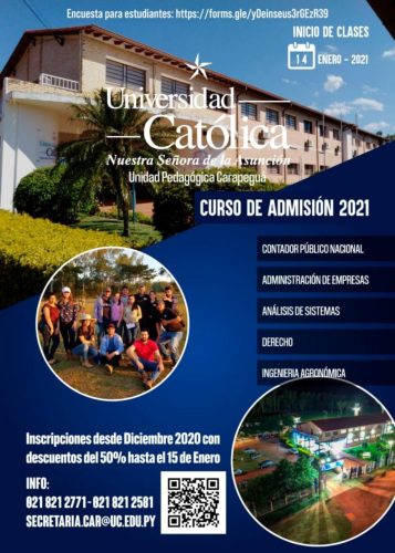 La Universidad Católica «Nuestra Señora de la Asunción» está presente en cada rincón del país, acercando educación superior de calidad a los jóvenes, futuros profesionales. En la ciudad de Carapeguá funciona hace 26 años la Unidad Pedagógica Carapeguá que en la actualidad ofrece cinco carreras de grado para la convocatoria 2021.