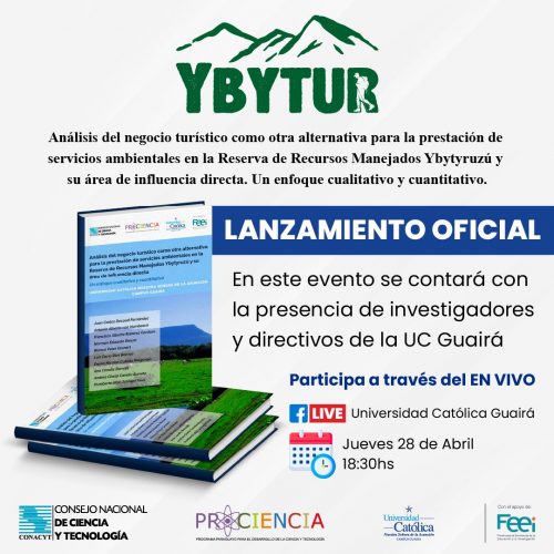 La Dirección de Posgrado e Investigación y la Facultad de Ciencias Contables, Administrativas y Económicas de la Universidad Católica «Nuestra Señora de la Asunción» Campus Guairá, invita a participar de la presentación del libro Análisis del negocio turístico como otra alternativa para la prestación de servicios ambientales en la Reserva de Recursos Manejados Ybytyruzú y su área de influencia directa. Un enfoque cualitativo y cuantitativo. El jueves 28 de abril a las 18:30 en el Aula Magna del Campus Universitario Guairá y será trasnmitido a través del Facebook Live @ucguaira.