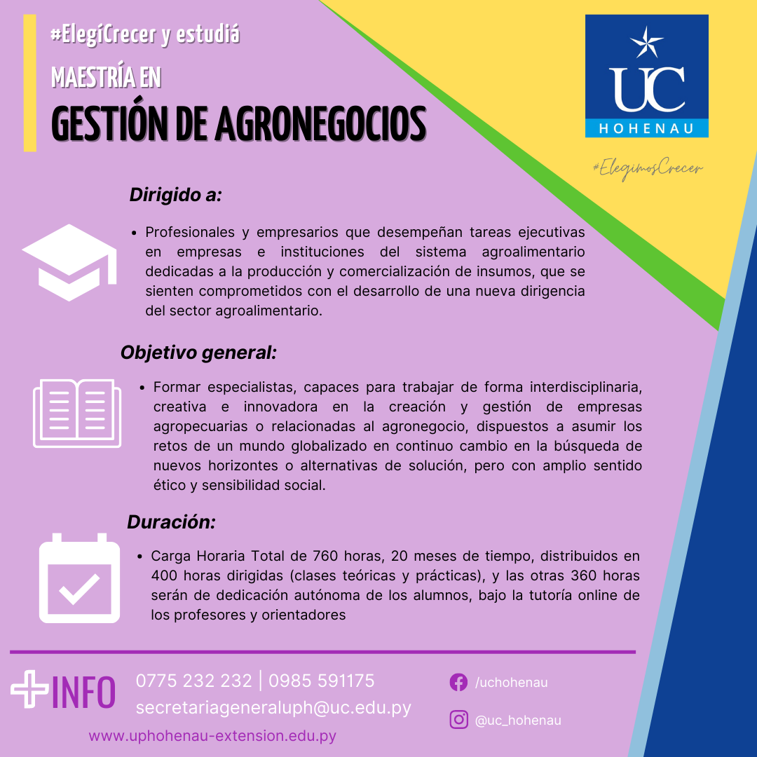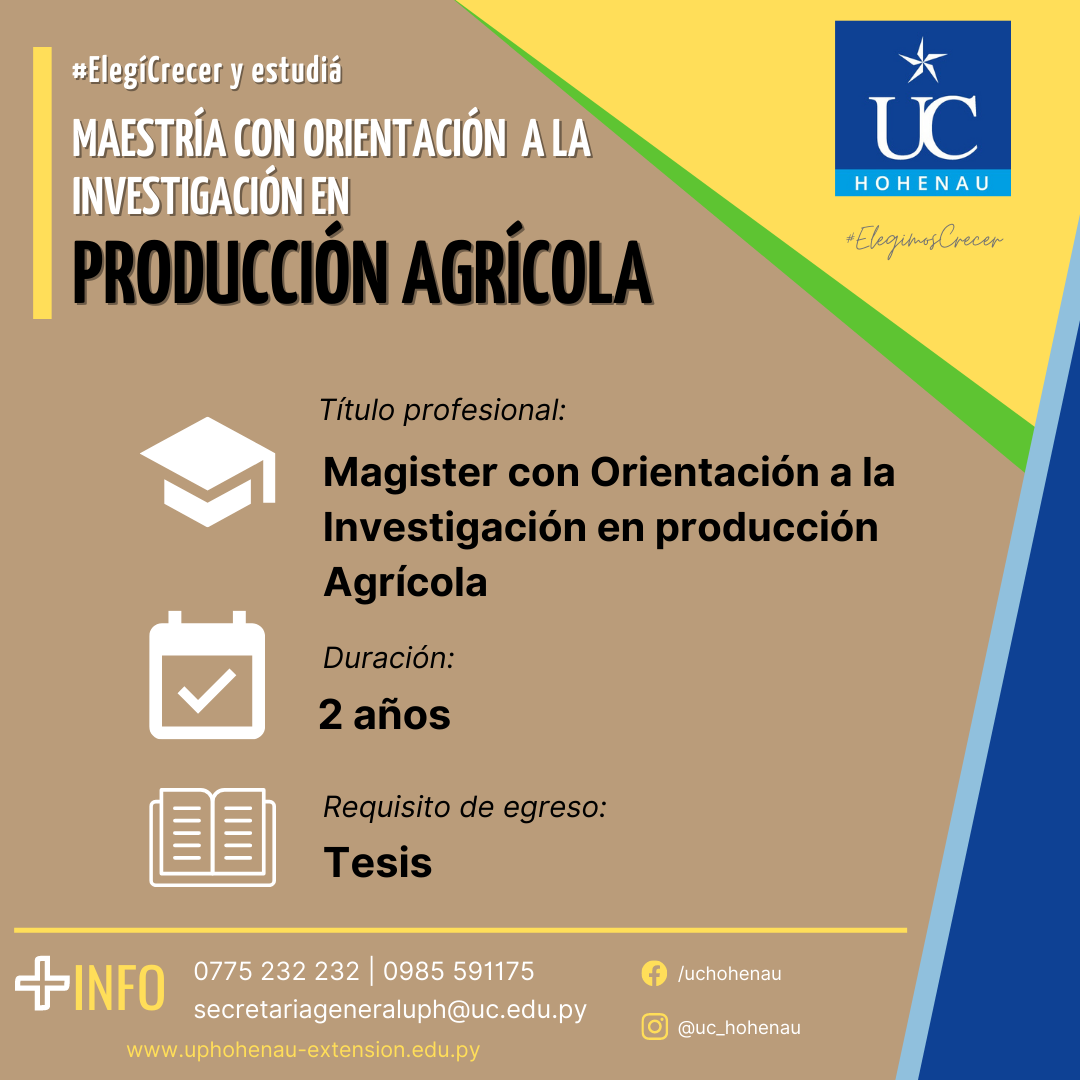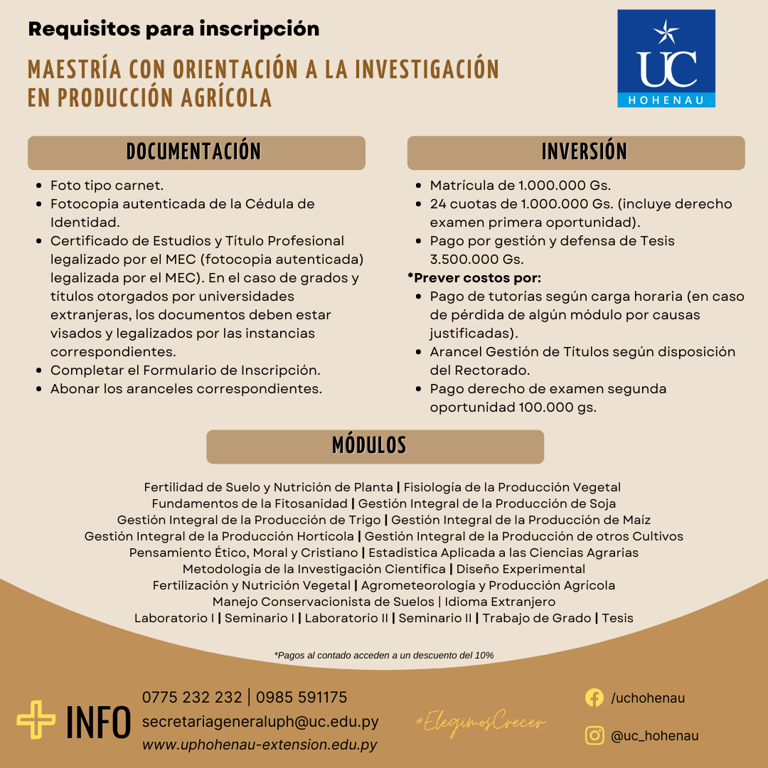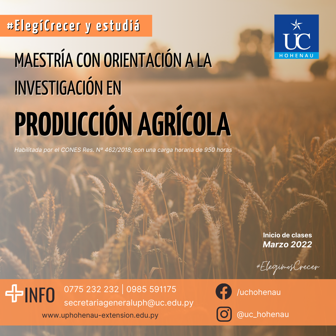 En marzo 2022 está programado el inicio de las clases en los cursos de posgrados habilitados en la Unidad Pedagógica Hohenau, los programas de postgrado en sus diversos niveles incluyen las maestrías y especializaciones y están orientados al campo de las ciencias agropecuarias, dirigido a profesionales en el área de la agronomía que deseen continuar su formación técnica y científica.