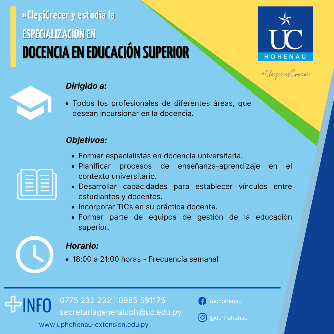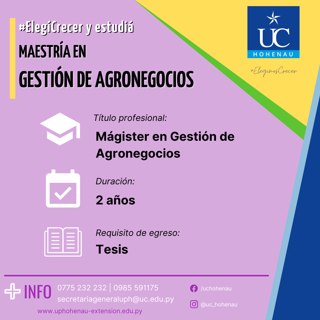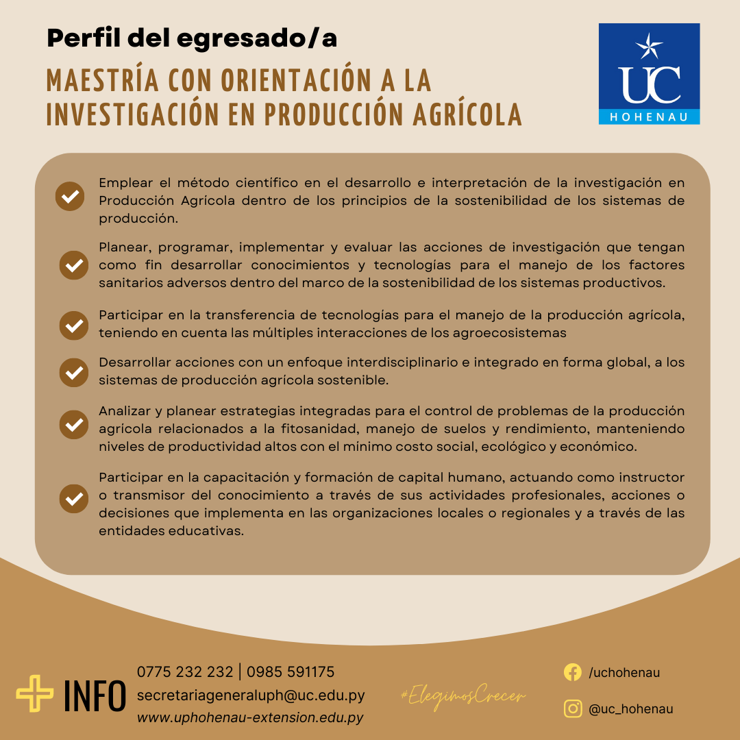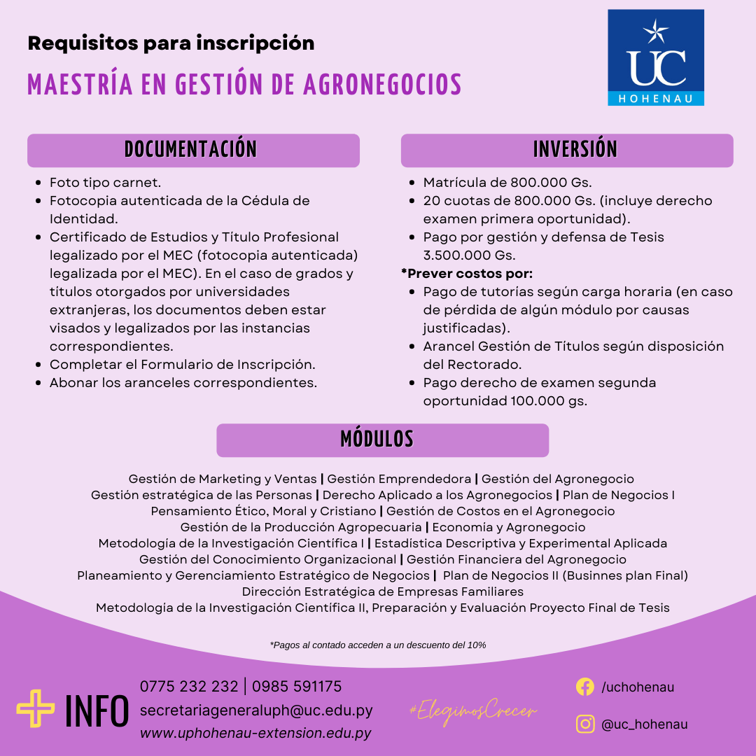 En marzo 2022 está programado el inicio de las clases en los cursos de posgrados habilitados en la Unidad Pedagógica Hohenau, los programas de postgrado en sus diversos niveles incluyen las maestrías y especializaciones y están orientados al campo de las ciencias agropecuarias, dirigido a profesionales en el área de la agronomía que deseen continuar su formación técnica y científica.