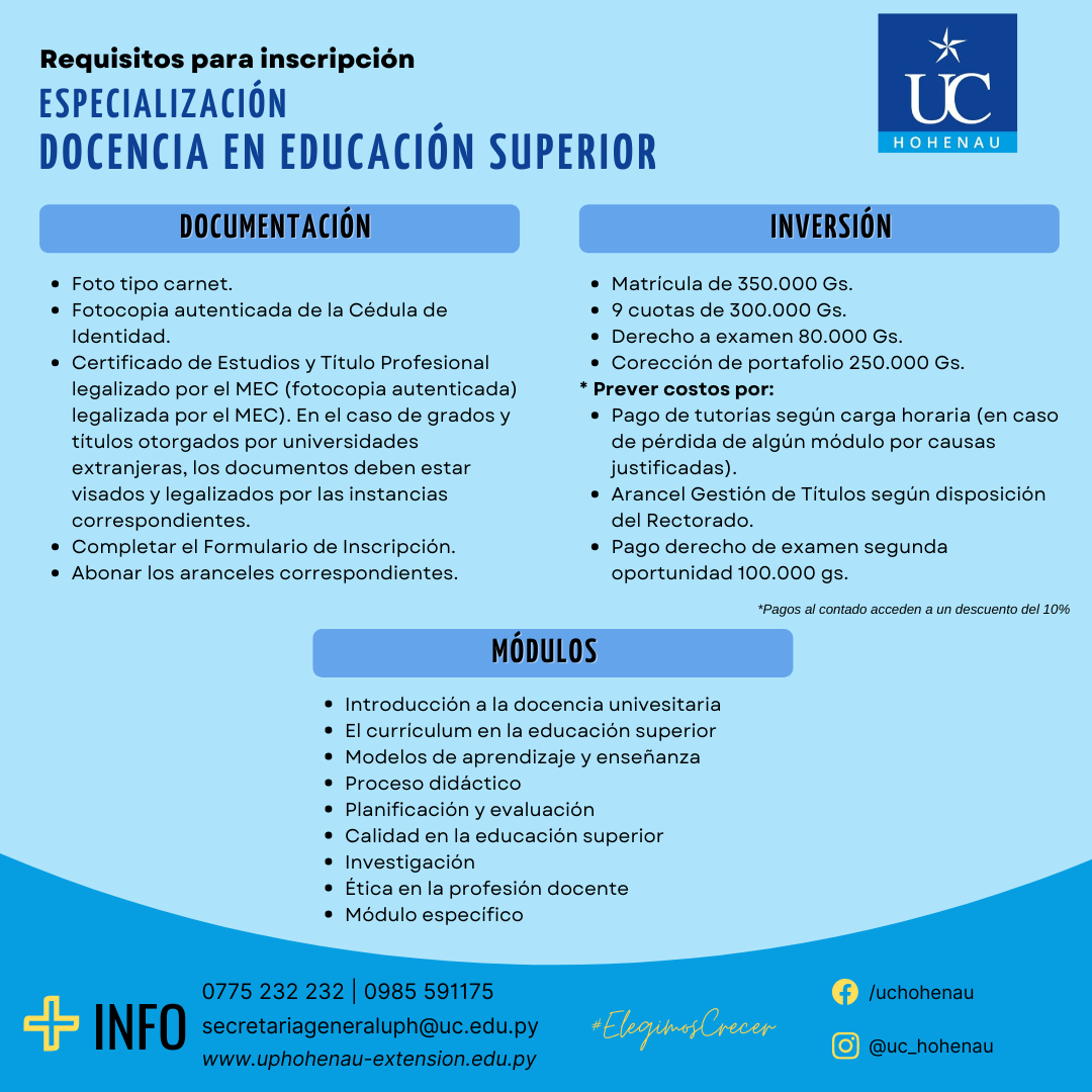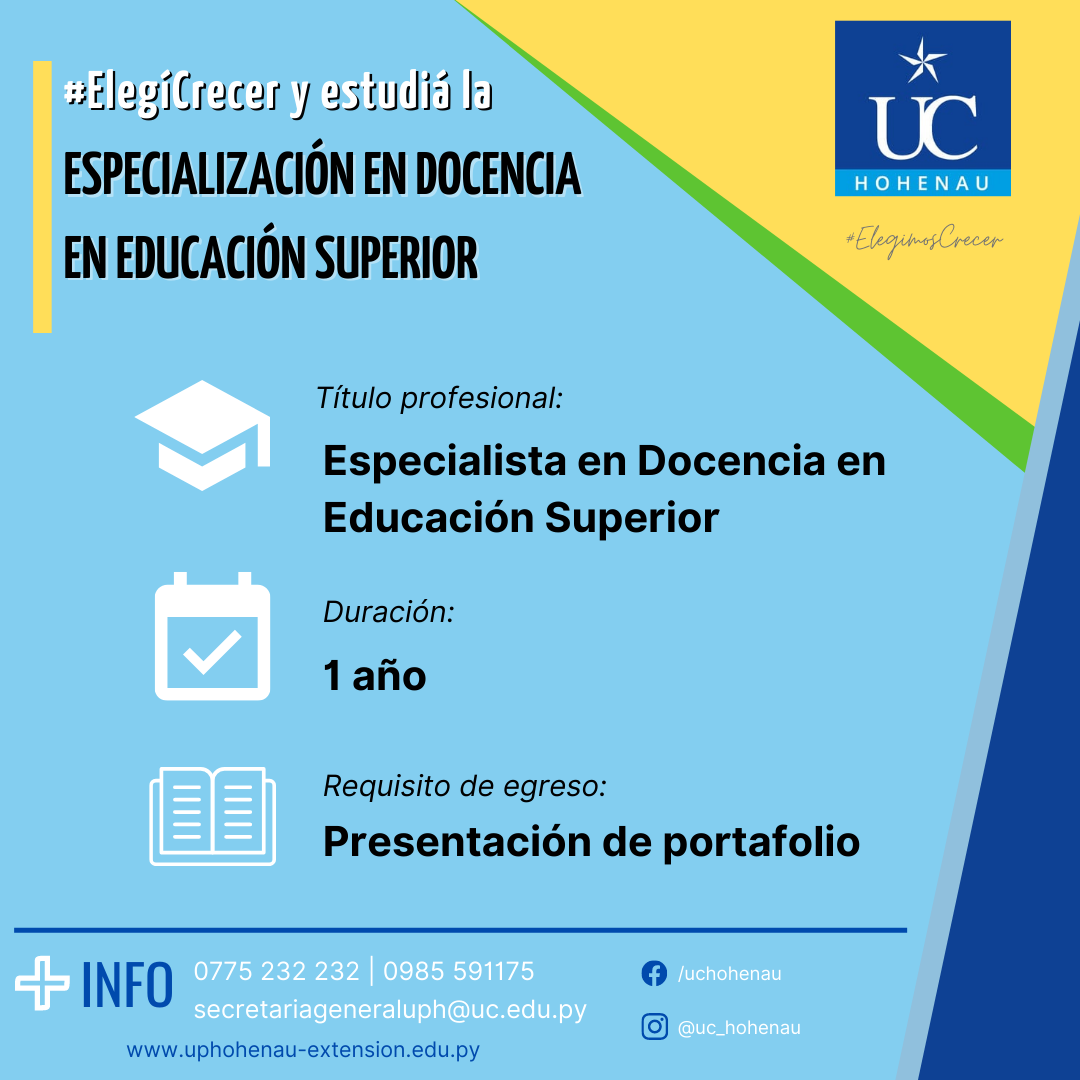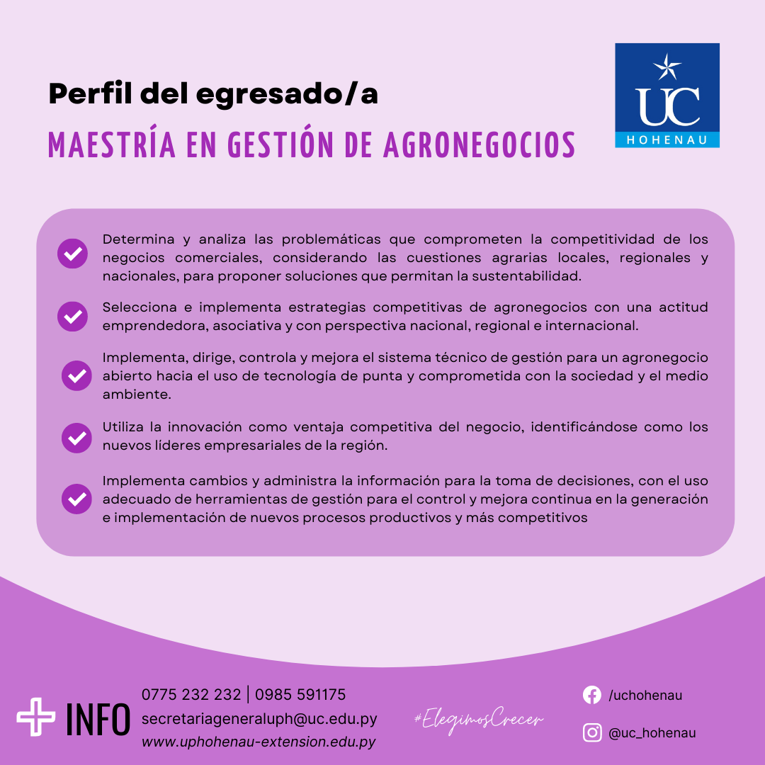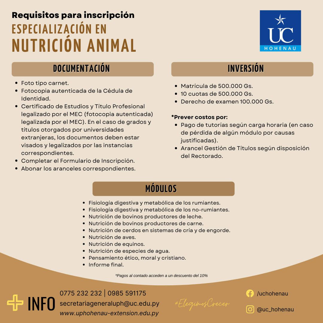 En marzo 2022 está programado el inicio de las clases en los cursos de posgrados habilitados en la Unidad Pedagógica Hohenau, los programas de postgrado en sus diversos niveles incluyen las maestrías y especializaciones y están orientados al campo de las ciencias agropecuarias, dirigido a profesionales en el área de la agronomía que deseen continuar su formación técnica y científica.