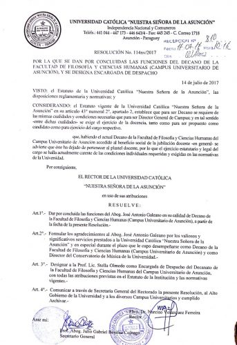 Por resolución nº 114nv/2017, el Rector dispuso que Stella Olmedo asuma desde el lunes como encargada de despacho del Decanato de la Facultad de Filosofía y Ciencias Humanas del Campus de Asunción.