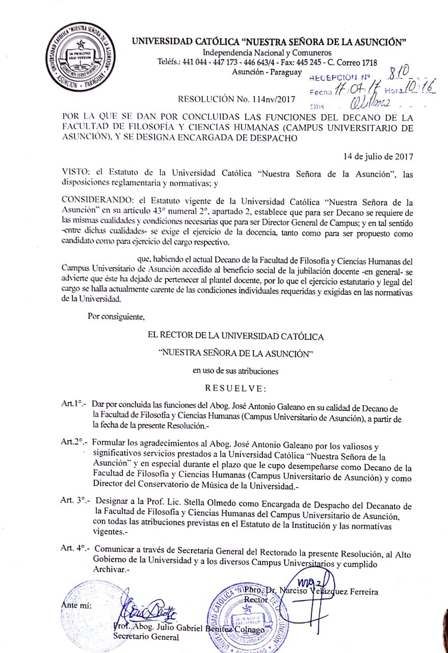 El documento señala también que el Abog. José Antonio Galeano Mieres concluyó sus funciones como decano al acogerse a los beneficios de la jubilación docente que otorga el Instituto de Previsión Social.