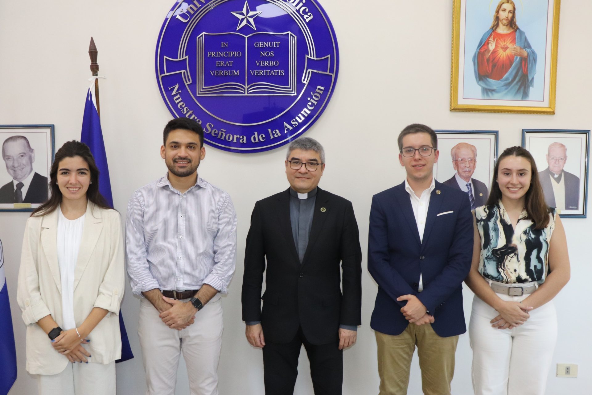 En la fecha, el Pbro. Dr. Narciso Velázquez Ferreira, Rector de la Universidad Católica “Nuestra Señora de la Asunción” recibió a los representantes del estamento estudiantil, Jorge Krish, presidente de la FEUCCA, Joaquim Dos Santos, vicepresidente de FEUCCA, Luján Montiel, tesorera de la FEUCCA y María Paz Jara, síndica suplente, miembros de la nueva Comisión Directiva de la Federación de Estudiantes de la Universidad Católica Campus Asunción, para el presente período 2024.
