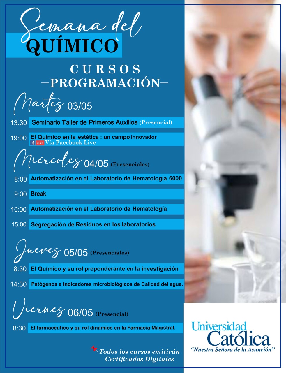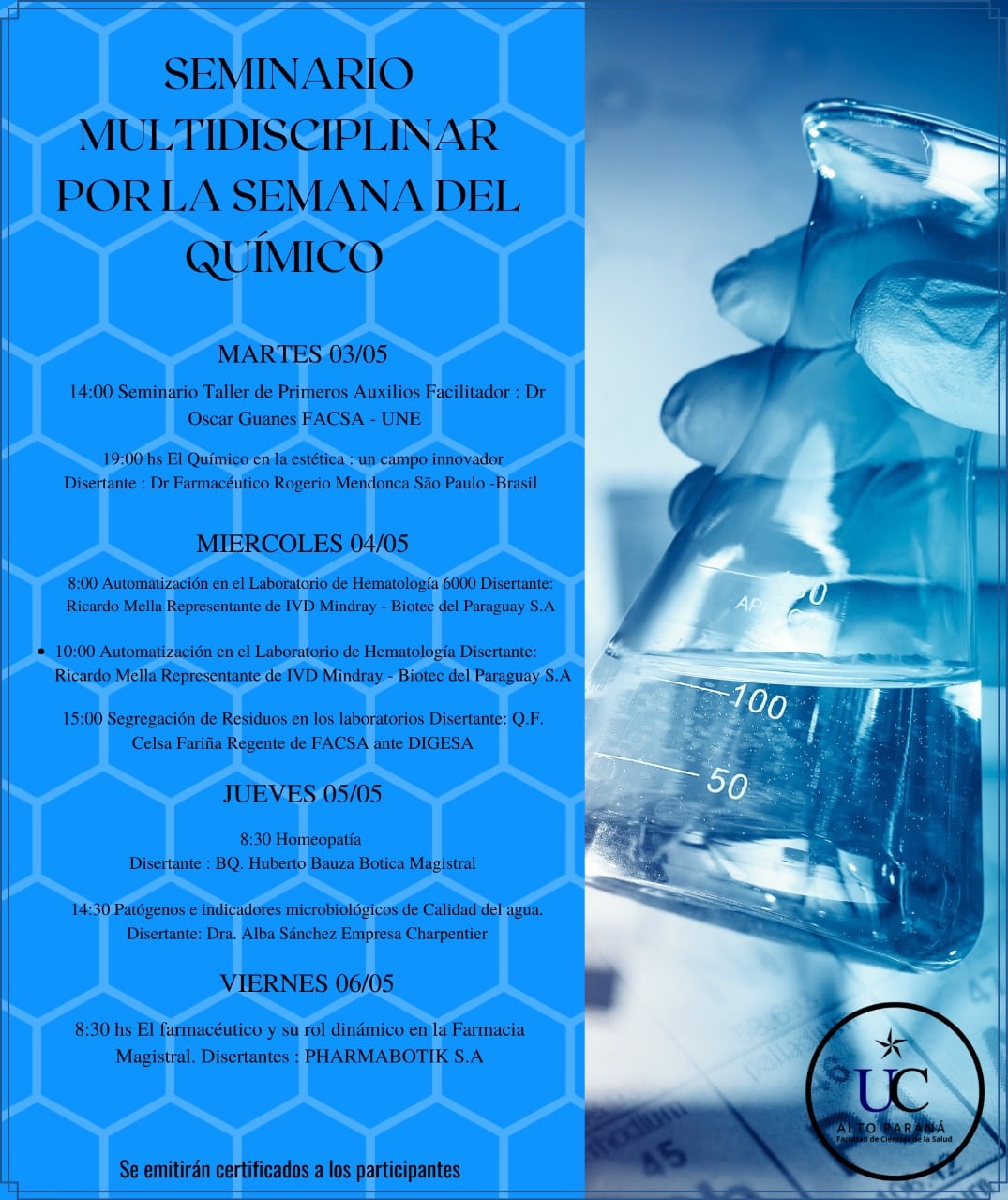 En el marco de conmemoración del Día del Químico Paraguayo, a celebrarse el próximo 8 de mayo, en la Facultad de Ciencias de la Salud del Campus Universitario Alto Paraná se desarrolló la Semana del Químico, con actividades académicas que incluyeron seminarios y talleres con certificación, donde se abordaron diversos temas de interés para los estudiantes. La agenda inició el martes 3 de mayo y culminó el jueves 5 de mayo.