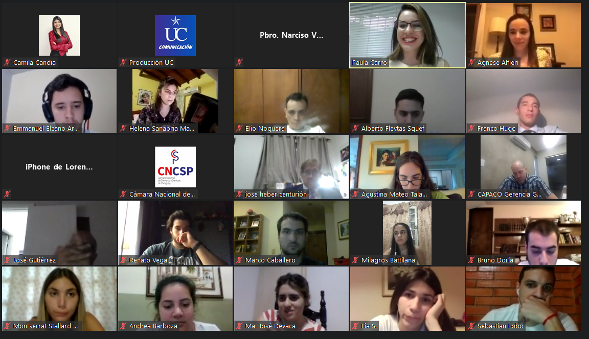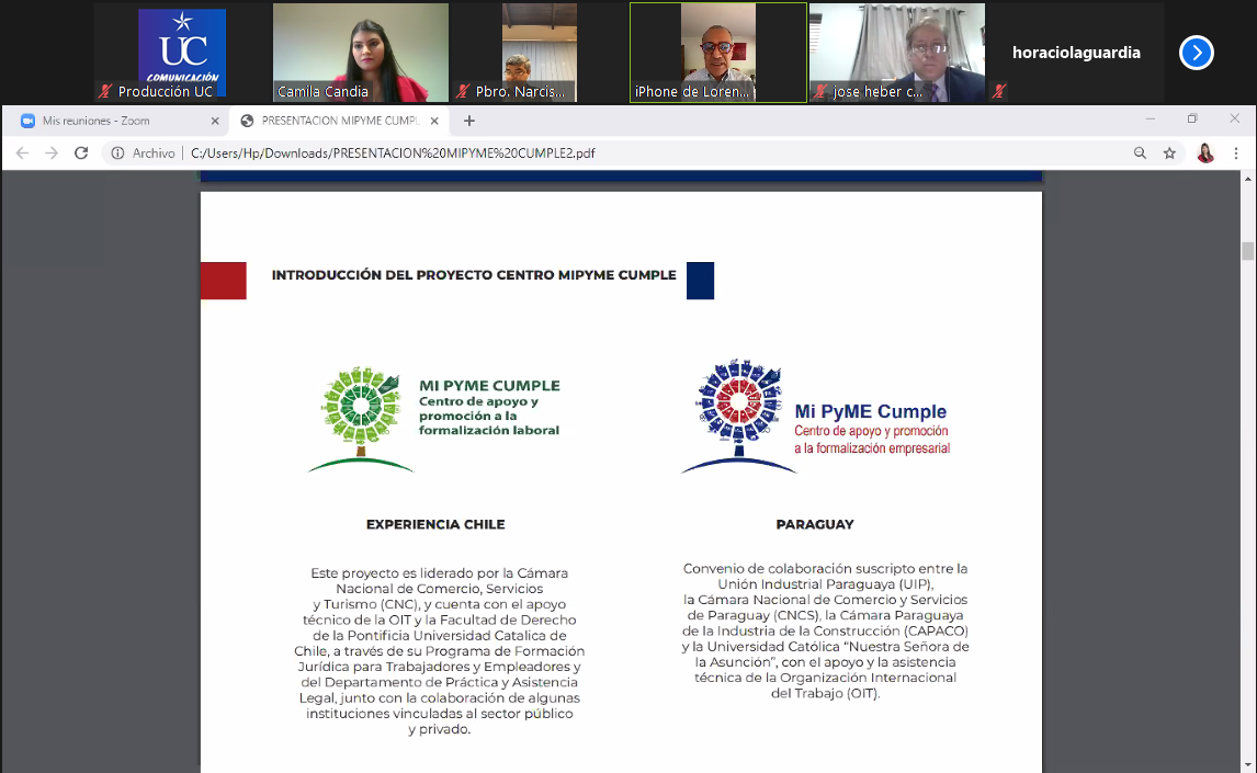 El acto de lanzamiento del proyecto se llevó a cabo el pasado viernes 9 de octubre, en una charla virtual a través de la plataforma digital Zoom, donde estuvieron como disertantes, representantes de cada institución, el Sr. Lorenzo Pelaez Dorantes, Especialista Técnico de la OIT, el Sr. Miguel Riquelme, Gerente General de la CNSC, la Abg. Paula Carro, Coordinadora de la Unidad de Inteligencia Estratégica de la UIP, el Sr. Oscar Sánchez Stark, Gerente General de la CAPACO, el Sr. José Heber Centurión, Director del Consultorio Jurídico de la Universidad Católica y la Lic. Camila Candia, Coordinadora del Proyecto Centro Mi PyME Cumple.