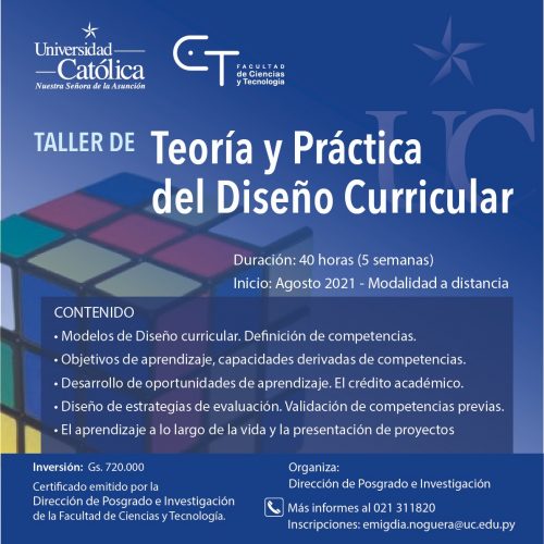 La Dirección de Posgrado e Investigación de la Facultad de Ciencias y Tecnología Campus Asunción organiza el Taller de Teoría y Práctica del Diseño Curricular, con clases en la modalidad a distancia a través del uso de herramientas digitales de enseñanza. A desarrollarse durante 5 semanas con una carga horaria de 40 horas reloj, inicia en Agosto 2021.
