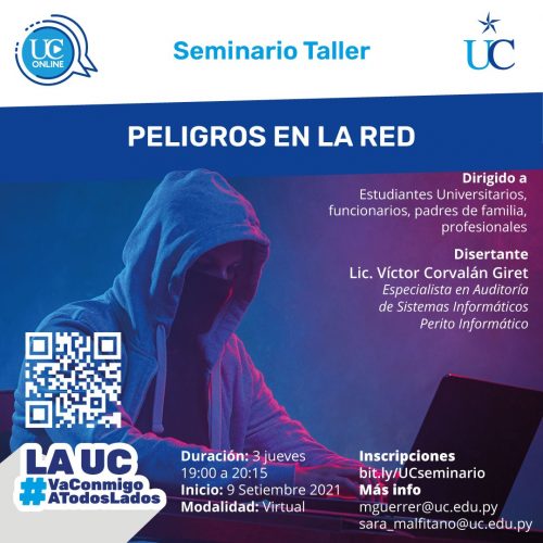 El Vicerrectorado de Administración y Finanzas de la Universidad Católica «Nuestra Señora de la Asunción» organiza el Taller Seminario «Peligros en la Red», dirigido a estudiantes universitarios, egresados, padres de familia, funcionarios de la UC y público interesado en general. Las clases se desarrollarán en la modalidad a distancia con el uso de herramientas digitales de enseñanza.