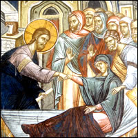 En aquel tiempo, al salir Jesús de la sinagoga, fue con Santiago y Juan a casa de Simón y Andrés. La suegra de Simón estaba en cama, con fiebre, y enseguida le avisaron a Jesús. Él se le acercó, y tomándola de la mano, la levantó. En ese momento se le quitó la fiebre y se puso a servirles. Al atardecer, cuando el sol se ponía, le llevaron a todos los enfermos y poseídos del demonio, y todo el pueblo se apiñó junto a la puerta. Curó a muchos enfermos de diversos males y expulsó a muchos demonios, pero no dejó que 1os demonios hablaran, porque sabían quién era él. De madrugada, cuando todavía estaba muy oscuro, Jesús se levantó, salió y se fue a un lugar solitario, donde se puso a orar. Simón y sus compañeros lo fueron a buscar, y al encontrarlo, le dijeron: “Todos te andan buscando”. Él les dijo: “Vamos a los pueblos cercanos para predicar también allá el Evangelio, pues para eso he venido”. Y recorrió toda Galilea, predicando en las sinagogas y expulsando a los demonios.