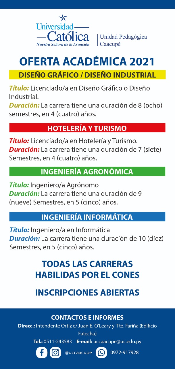 Con el objetivo de ayudar a los bachilleres en la toma de una decisión informada para su futuro profesional, presentamos las carreras habilitadas para el periodo lectivo 2021 en cada una de las sedes de la Universidad Católica «Nuestra Señora de la Asunción», firmes en nuestro compromiso de formar a los mejores en la tarea específica de su profesión.