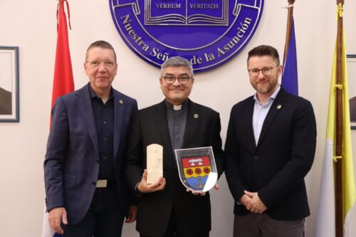 Durante la firma, el Rector hizo una breve presentación sobre la Universidad y destacó la importancia de este convenio, que coincide con el vigésimo aniversario de la carrera de Medicina en Asunción, la cual ha obtenido recientemente su tercera acreditación de excelencia. Como símbolo de gratitud, el Rector entregó a los firmantes un maletín de cuero nacional con el escudo de la UC, junto con pines institucionales y de la facultad. En correspondencia, el administrador Martin Andreas Johannes Diek obsequió al Rector una imagen de San Bonifacio, pidiendo que siga acompañando la formación de excelentes médicos para el país y para el mundo, mientras que Timo Deiters entregó un escudo de la Gobernación del Emsland.