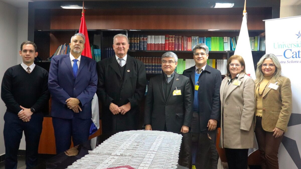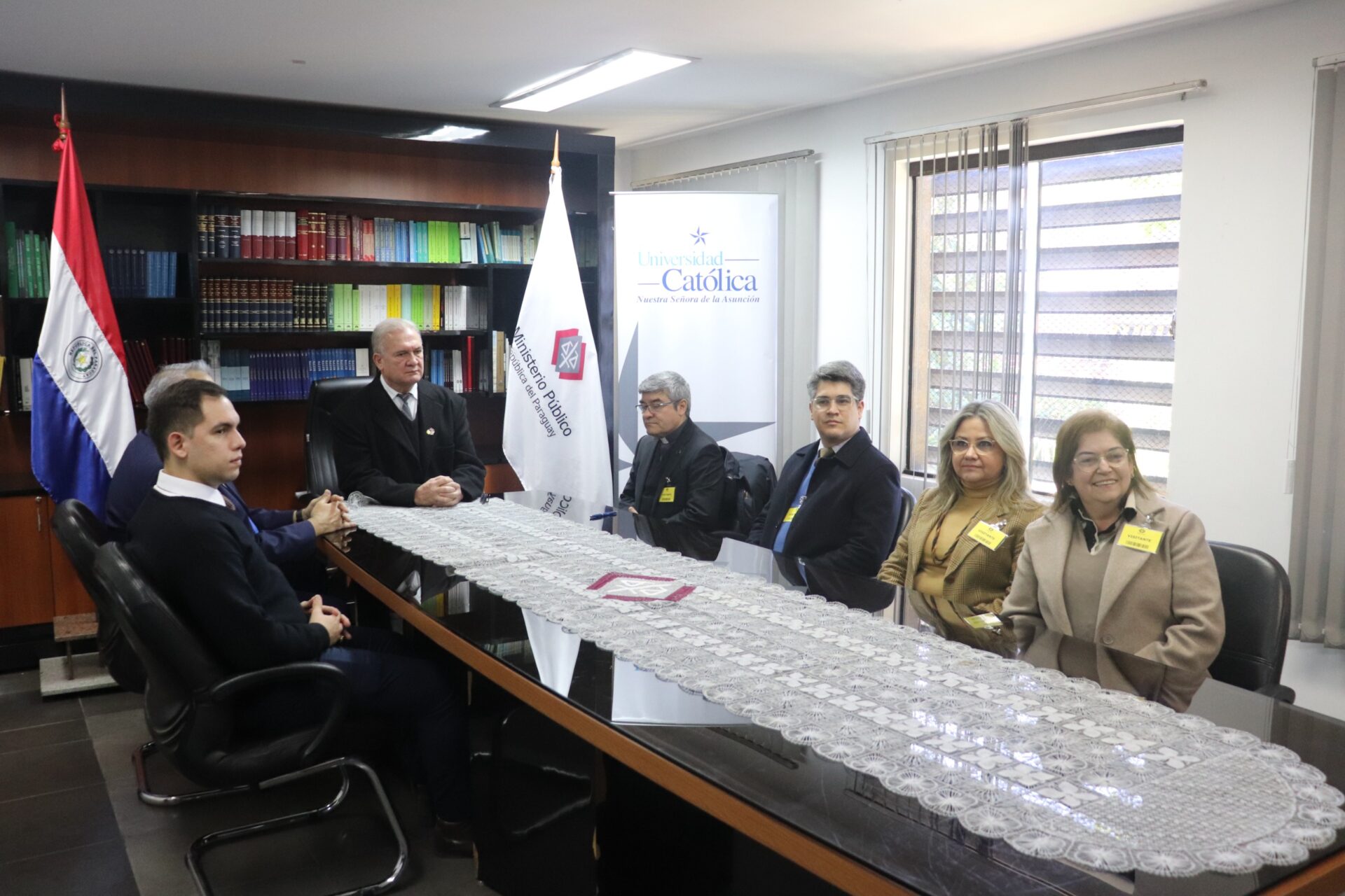 Participaron del acto de firma de convenio, el Rector de la Universidad Católica, el Fiscal General del Estado, la Dra. Manuela Balcázar, Directora General del Campus Alto Paraná, la Bioquímica Farmacéutica Lucía Torres, Decana de la Facultad de Ciencias de la Salud de Alto Paraná, el abogado Mag. Miguel Ortiz Rodríguez, jefe de gabinete de Rectorado y Jorge Sosa, fiscal adjunto del Alto Paraná.