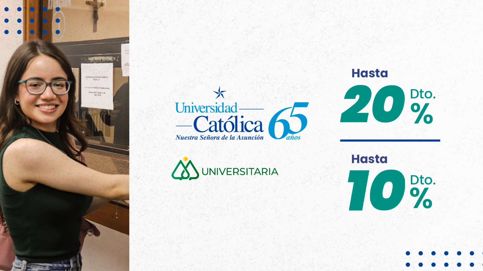 La Universidad Católica «Nuestra Señora de la Asunción» anuncia a sus estudiantes que está en vigencia la exclusiva promoción con la Cooperativa Universitaria durante todo el mes de marzo del 2025, ofreciendo un 20% de descuento en el pago del semestre y/o el año completo de carreras de grado. Este beneficio está disponible para aquellos alumnos que abonen el semestre o el año completo, utilizando tarjetas de crédito CABAL, PANAL y MASTERCARD emitidas por la Cooperativa Universitaria, o bien a través de préstamos otorgados por la misma entidad.