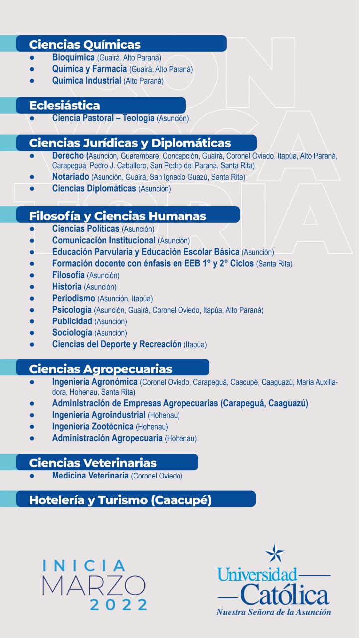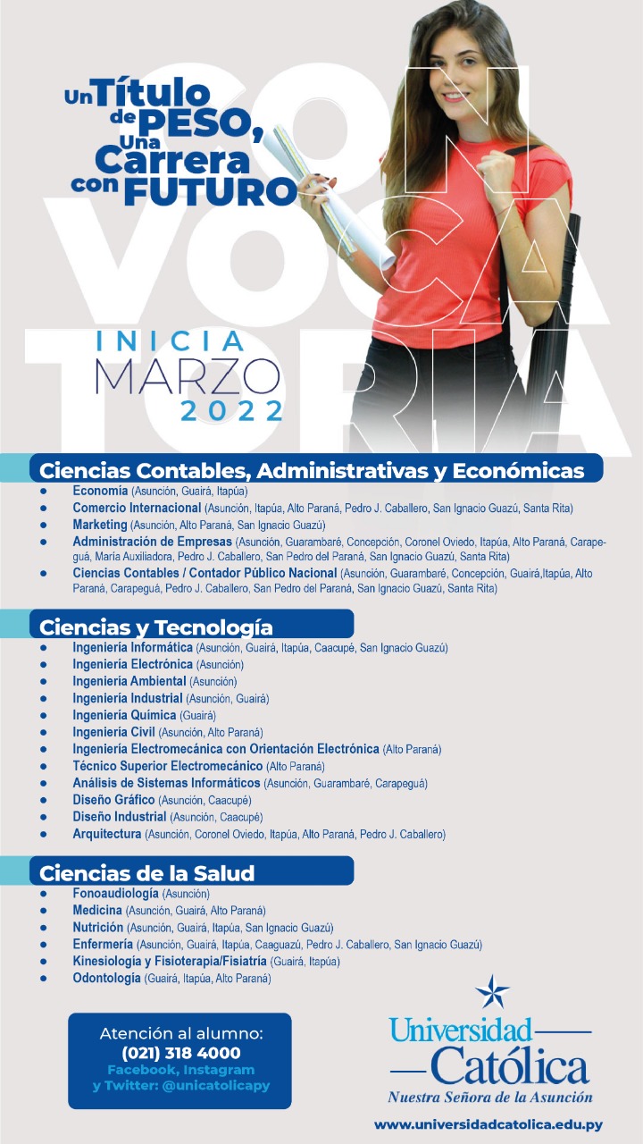 La Universidad Católica «Nuestra Señora de la Asunción» marca presencia en la Expo Universidades convocada por el Diario Última Hora, acercando toda la oferta académica vigente en la alta casa de estudios a todos los interesados. La actividad se lleva a cabo en el estacionamiento del Shopping Mariscal, los días miércoles 23 y jueves 24 de febrero de 10:00 a 20:00.