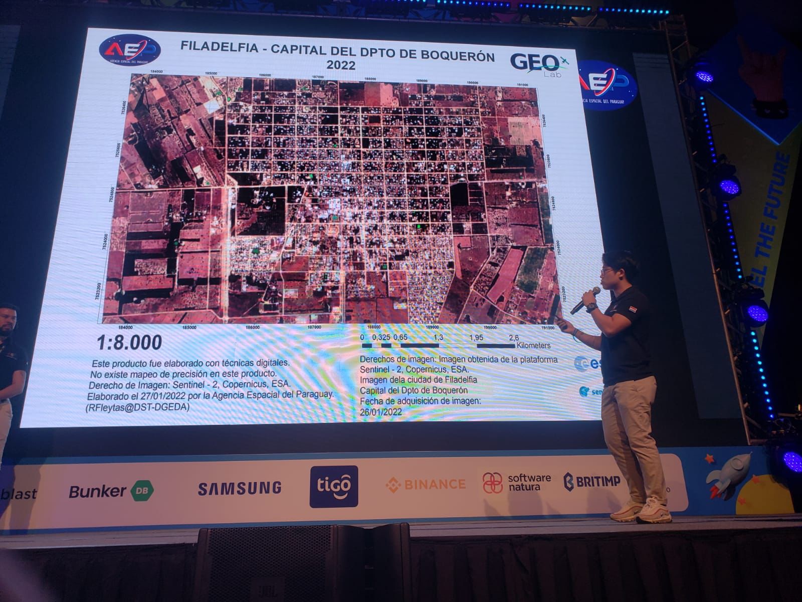 Para el último día de la feria de tecnología, nuestros estudiantes destacados también tuvieron una notable participación. Por un lado, David Kwon, estudiante de la carrera de Ingeniería Ambiental acompañó la exposición de la Agencia Espacial del Paraguay, lugar donde se encuentra realizando una pasantía, en la charla «Desarrollo aeroespacial, una ventana al futuro».