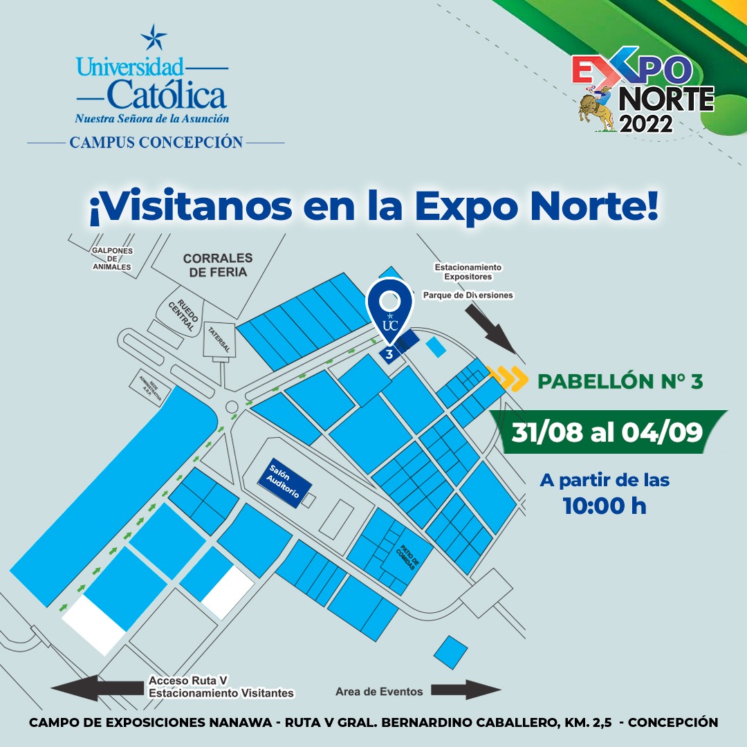 La Universidad Católica «Nuestra Señora de la Asunción» confirmó su participación en la mayor feria de exposiciones del norte del país en Concepción, para enseñar interesantes propuestas académicas de grado y posgrado, charlas con renombrados expositores, servicios de consultorio jurídico, orientación vocacional para estudiantes, reconocimiento a egresados distinguidos y sorteo de becas. La feria estará habilitada del 31 de agosto al 04 de septiembre, de 10:00 a 22:00 horas, en el Campo de Exposiciones Nanawa, Concepción.