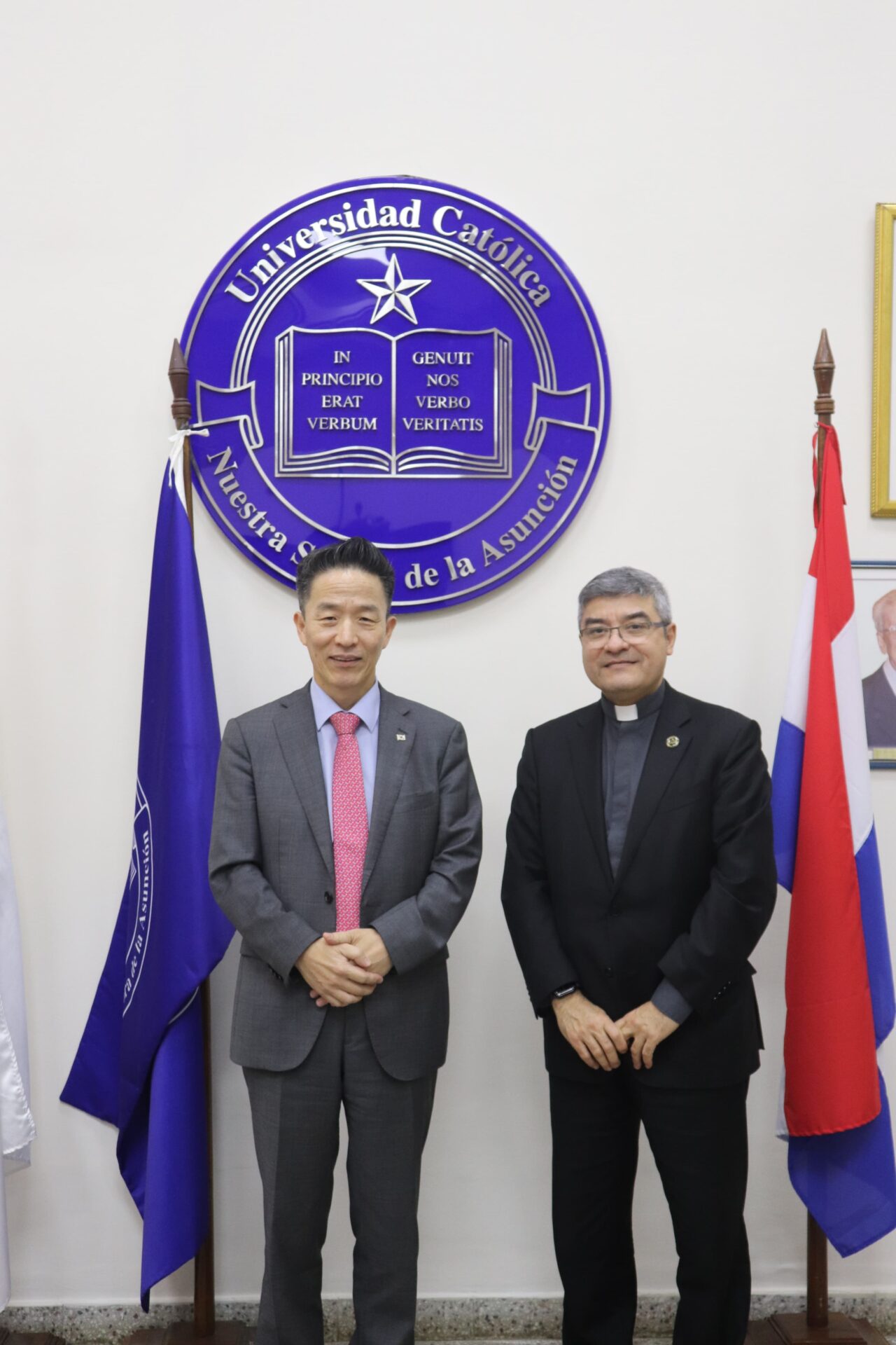 El jueves 13 de junio, el Rector de la Universidad Católica, Dr. Narciso Velázquez Ferreira sostuvo una reunión con el embajador de Corea en Paraguay, Sr. Chan-sik Yoon, con el objetivo de fortalecer la cooperación institucional con oportunidades existentes con la República de Corea en diversas áreas, incluidas movilidad estudiantil y becas.