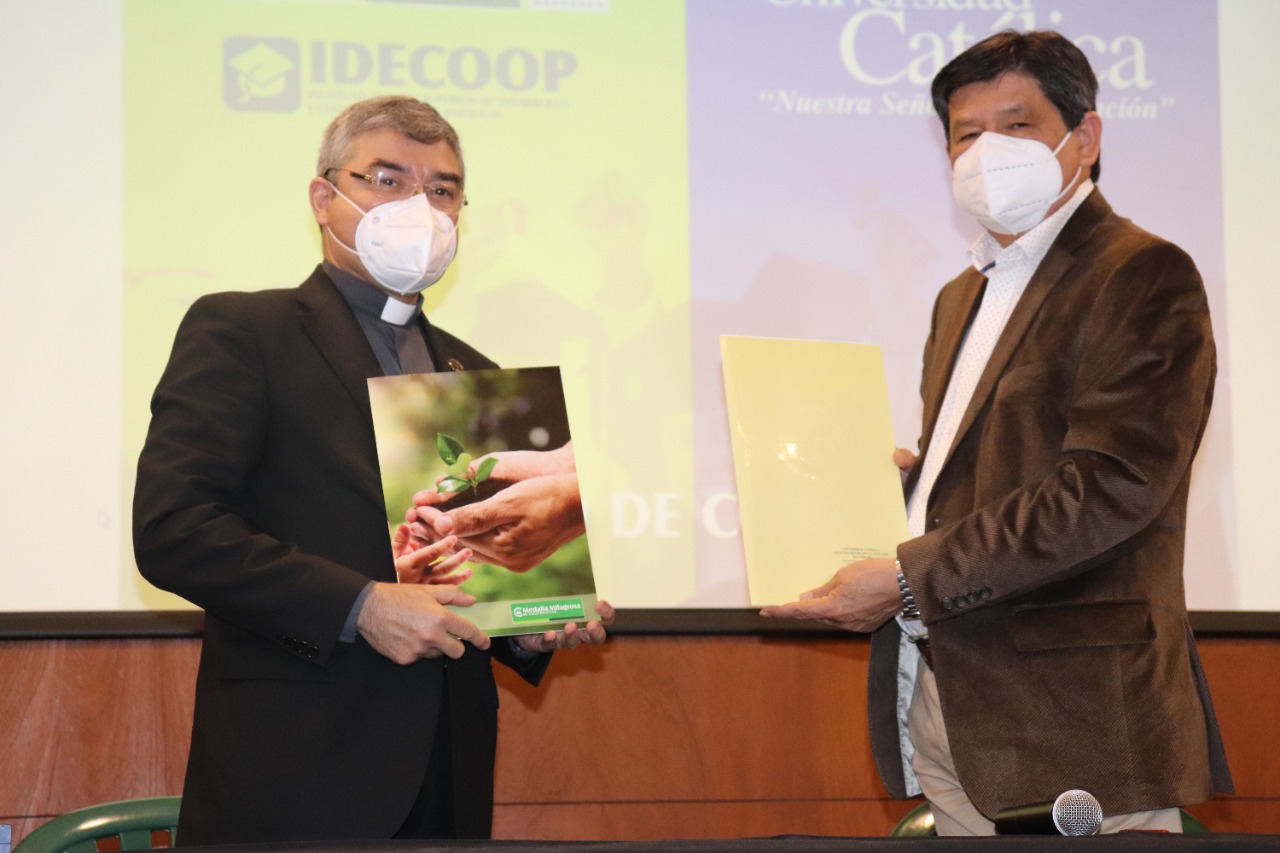 Firmaron el acuerdo, por la Universidad Católica, el Padre Rector Dr. Narciso Velázquez Ferreira, y por la Cooperativa Medalla Milagrosa, el presidente del Consejo de Administración, Lorenzo Barreto Duarte y el secretario del Consejo, Fermín Flor Cañiza, en un acto oficial que se celebró en el Aula Magna del Instituto Técnico Superior de Desarrollo y Cooperativismo del Paraguay- IDECOOP.