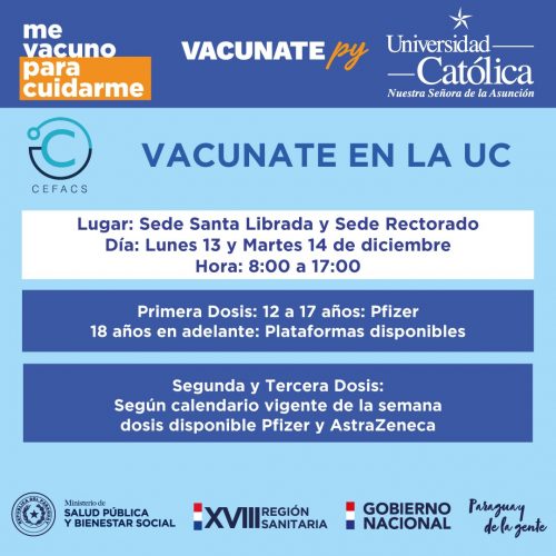 En el marco del plan de vacunaciones contra el Covid-19 promovido por el Ministerio de Salud Pública y Bienestar Social, la Universidad Católica “Nuestra Señora de la Asunción”, siempre al servicio de la comunidad, pone a disposición las sedes de Santa Librada y Rectorado como punto de acceso a las inmunizaciones contra el Covid-19.